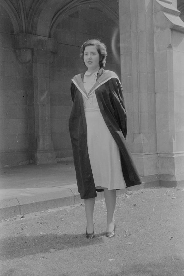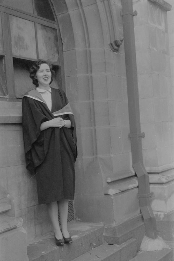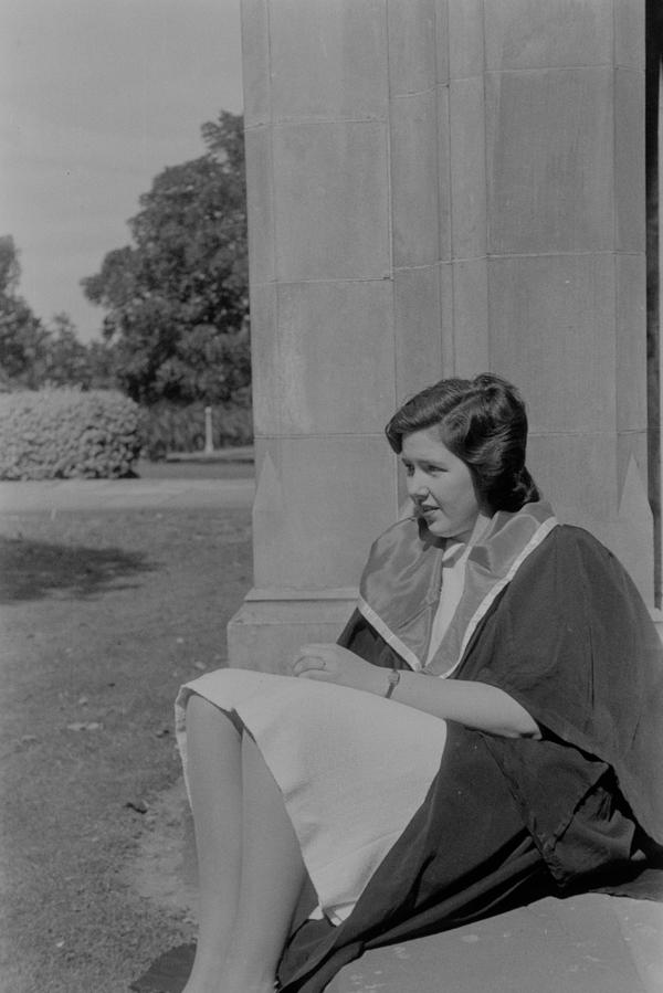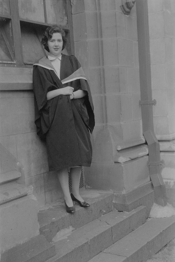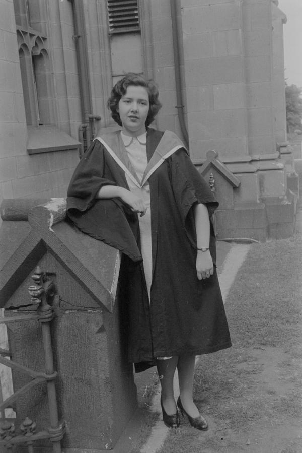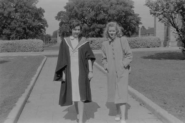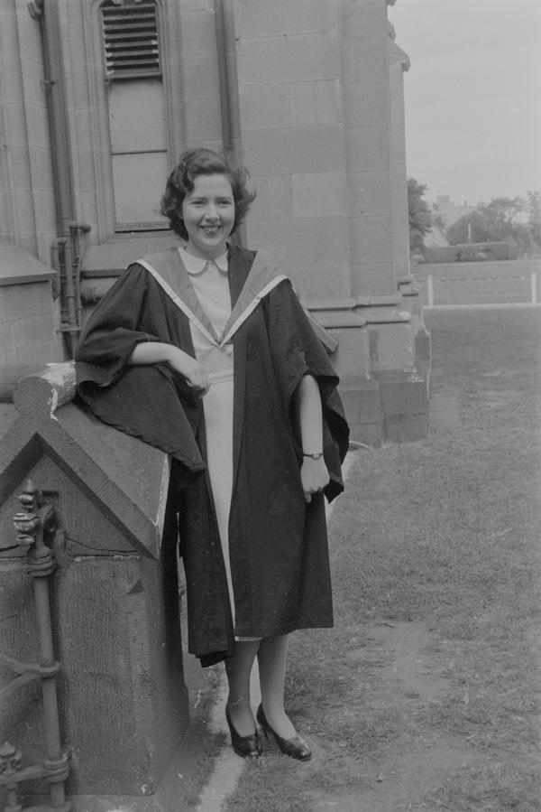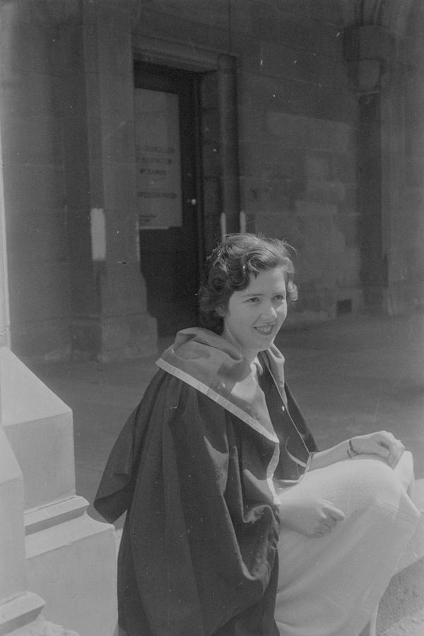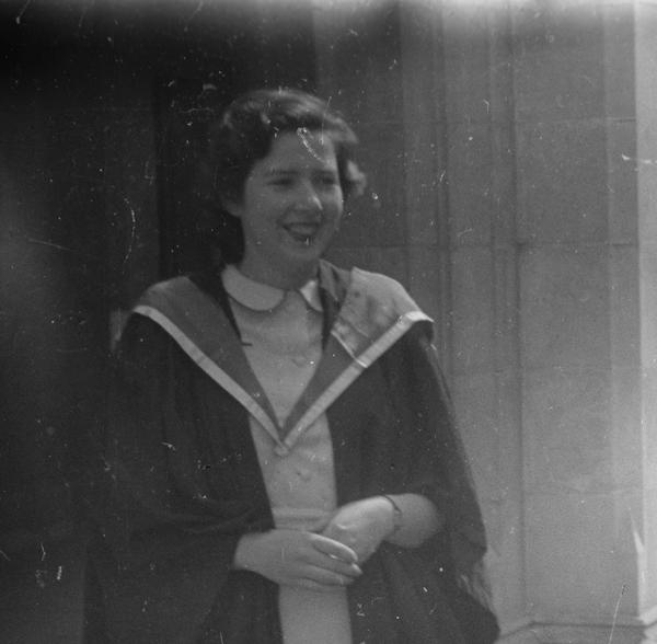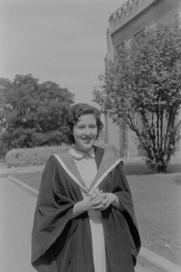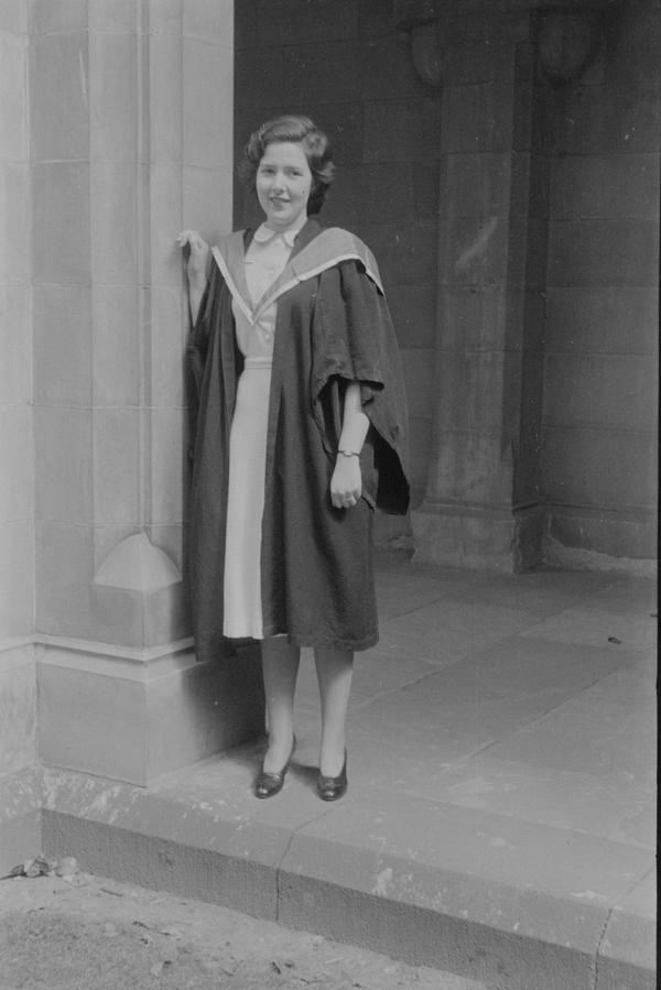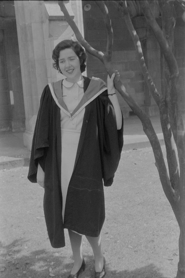 The young lady wearing an academic gown must be Eleani. "Philos" could refer to a Doctor of Philosophy degree. "First" is somewhat puzzling. Did Eleani have more than one PhD? In the 1940s there were not a lot of women in Australia (or anywhere else in the world) with several PhD degrees.