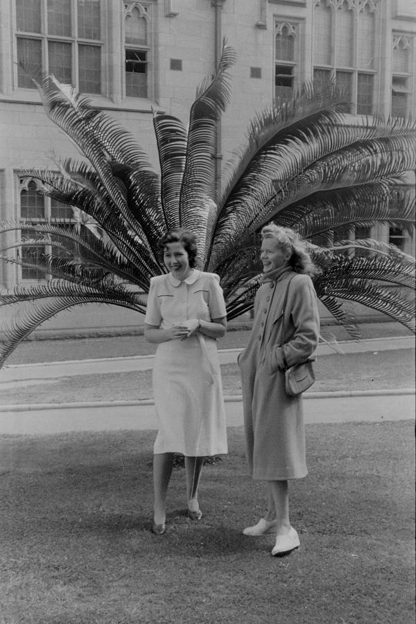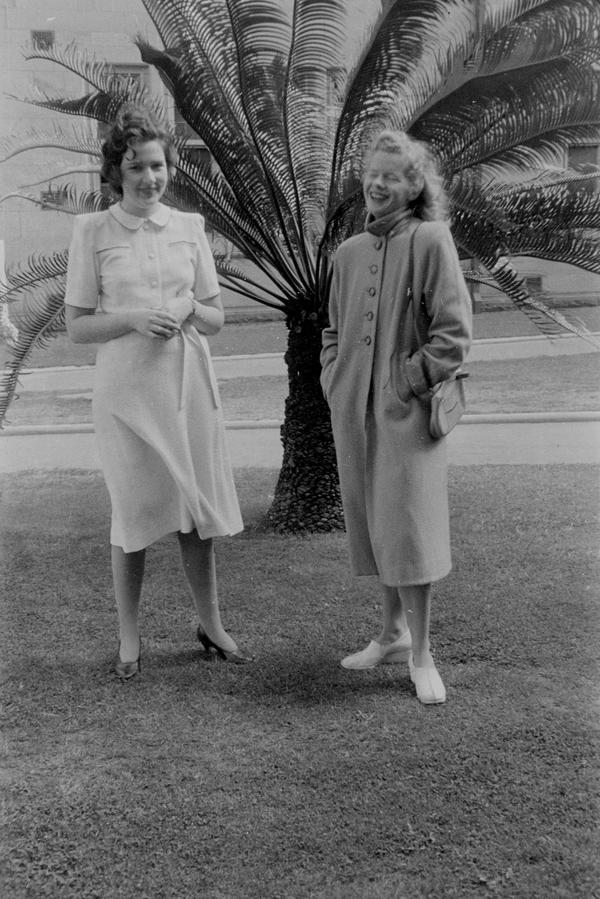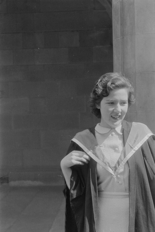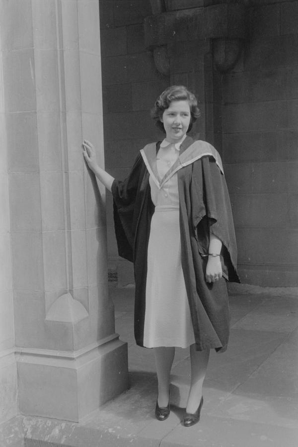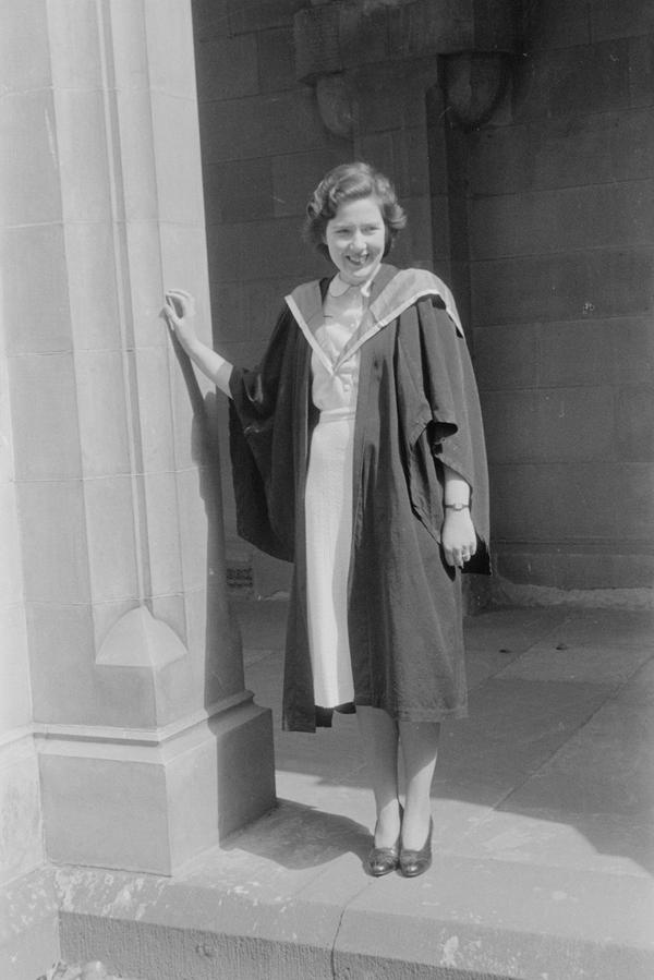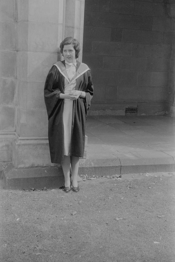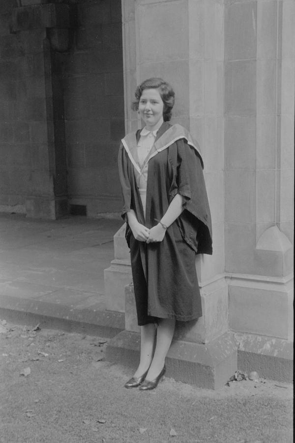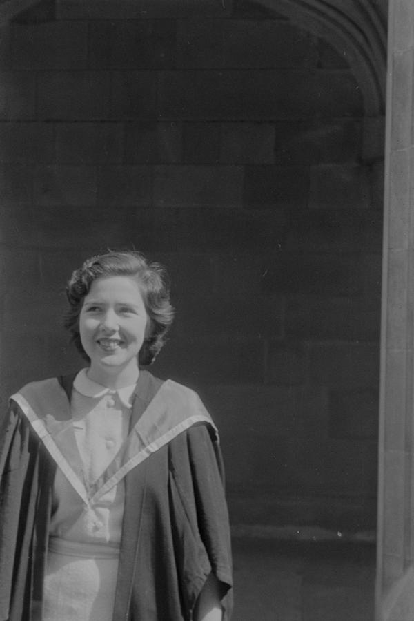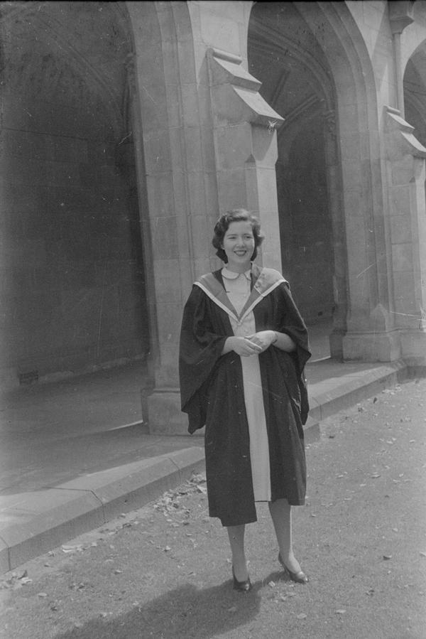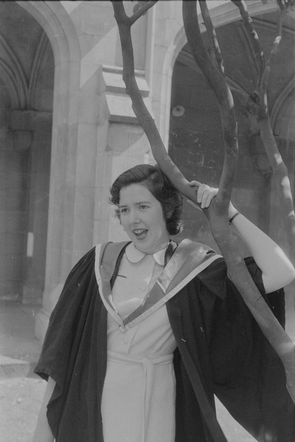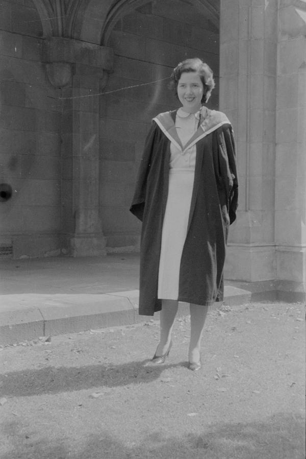 The young lady wearing an academic gown must be Eleani. "Philos" could refer to a Doctor of Philosophy degree. "First" is somewhat puzzling. Did Eleani have more than one PhD? In the 1940s there were not a lot of women in Australia (or anywhere else in the world) with several PhD degrees.