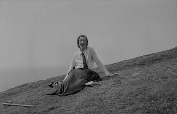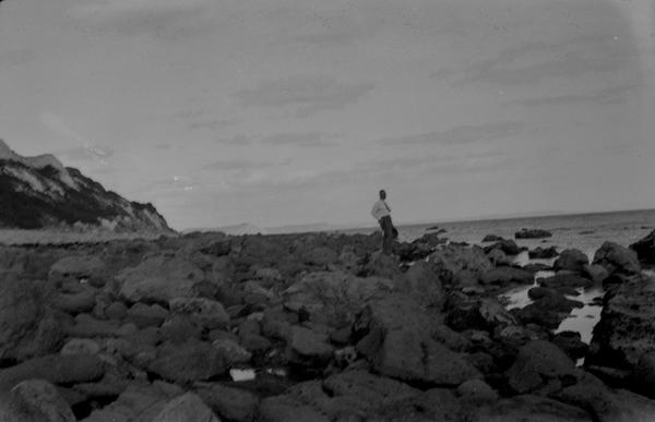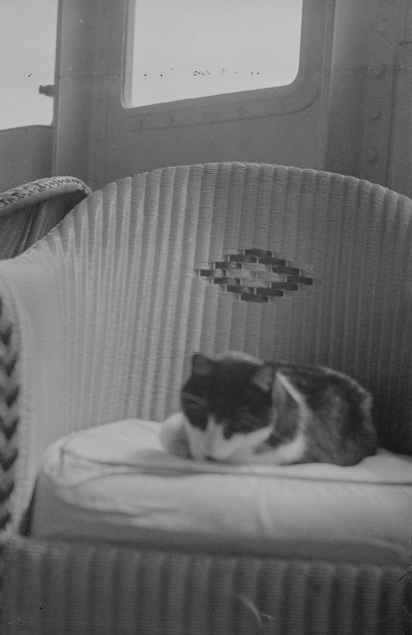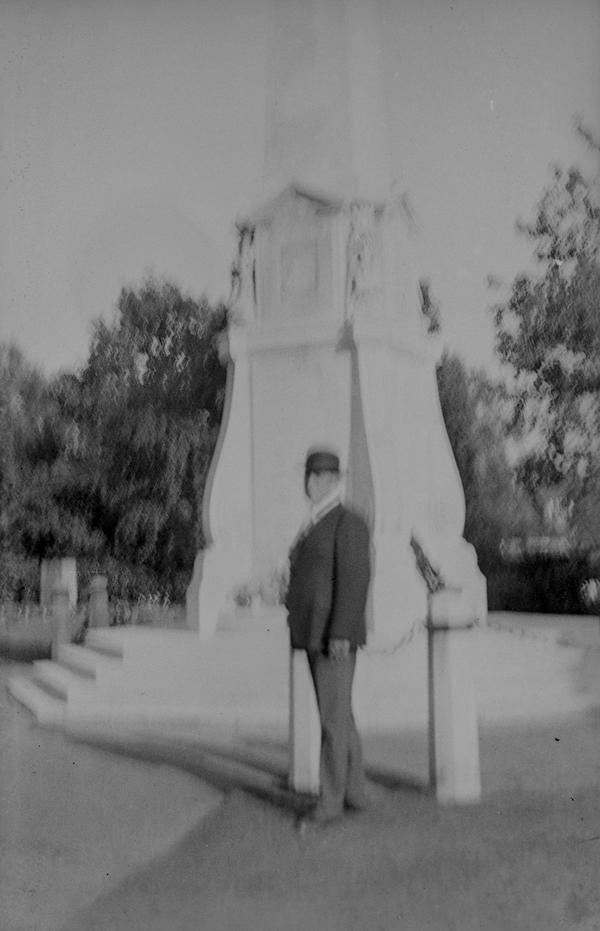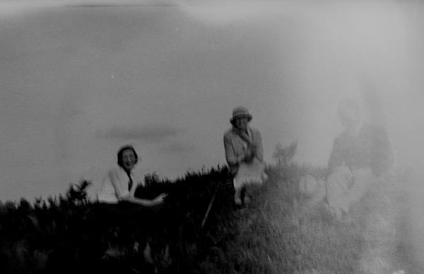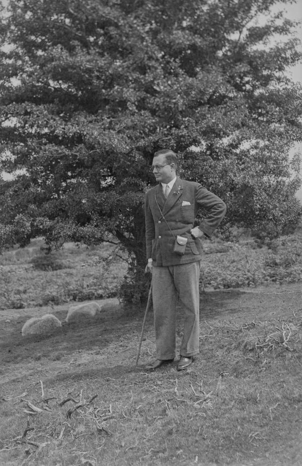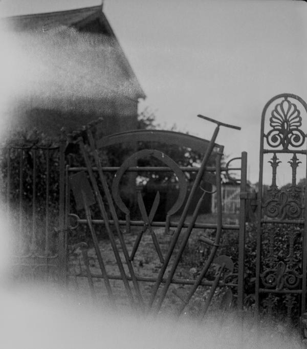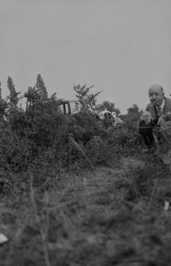 The negatives are full-frame (4x6.5 cm) size shot on type 127 film. An interesting detail is the series of notches that appears on all of them. Most likely, the notches were made in the frame window of the camera but their purpose is not clear. They might be used during enlarging to quickly identify the emulsion side of the negative. The gentleman on this image must be the photographer. He used a wooden walking stick which we also see in the corner of the frame of this portrait. The photographer wears a camera case. Judging by the size the camera was of a simple folding type, a very popular design in 1930s and 1940s. The images are not particularly sharp indicating that this was not a top-end camera. There focus is not always uniform througout the frame, a common problem in folding cameras especially of a cheaper design resulting from the lens plane not being parallel to the film plane.