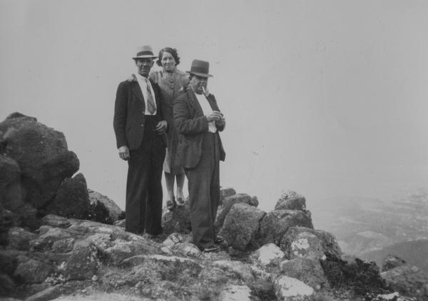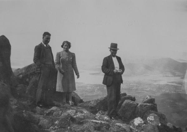 No trip to Tasmania would be complete without climbing to the top of Mount Wellington. The Pinnacle Drive leading to the top was opened on 23 January 1937, only three years before the photographs were taken. Our visitors seemed to be lucky with the weather that day. The temperature in January on Mount Wellington is between 5 °C (average low) to 13 °C (average high). The views worth the trouble though.