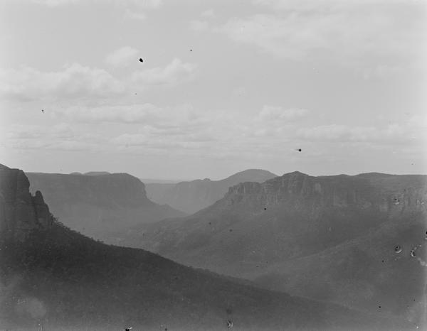 The photographer wrote "Sylvia Falls" on the emulsion side of this plate. The waterfalls in the Valley of the Waters in Blue Mountains were frequently photographed in the 1900s and still are today. See, for example, this photograph taken in the 1900s. It is also labelled Sylvia Falls, Leura. Jim Smith in his book "Blue Mountains Photographer Walter Rumble" includes a photograph of Lodore Falls that looks identical. The two waterfalls are just 50 metres from each other, so they could be easily confused. There used to be a track to the base of Lodore Falls in the 1900s where a lot of photographs were taken. Unfortunately, this place is no longer accessible unless you are keen enough to climb wet rocks.