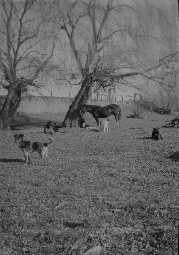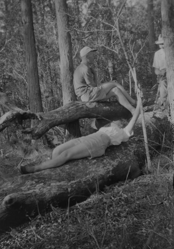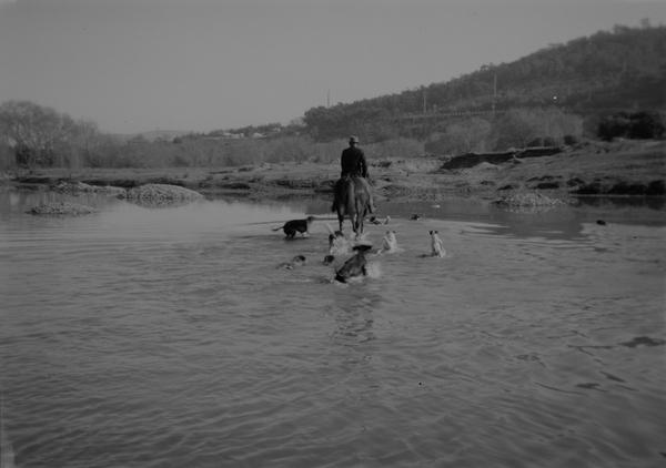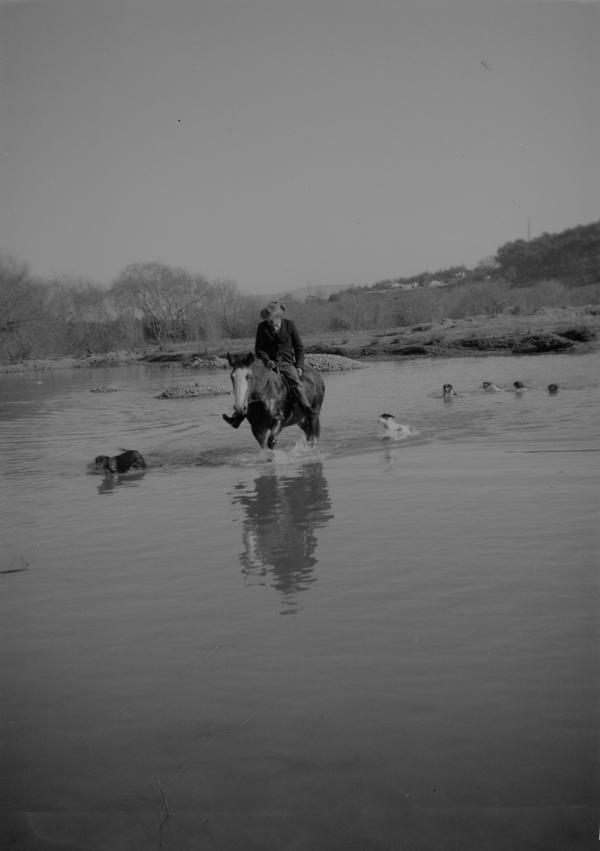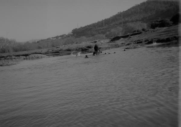 These 15 negatives appear to come from two rolls shot on different occasions. Quite a few of them show a rider on a horse crossing the river (Macleay River near Kempsey?) together with his dogs. The river is fairly deep, so the dogs had to swim to follow their master and his horse. The second series depicts some outdoor activities, a picnic, hunting or both. It was a bit unusual to see a lady in shorts in one of the pictures, but apparently ladies started wearing them as early as 1930s for sports and outdoor, so this should not be unusual at late 1940s and 1950s when the image was presumably taken.