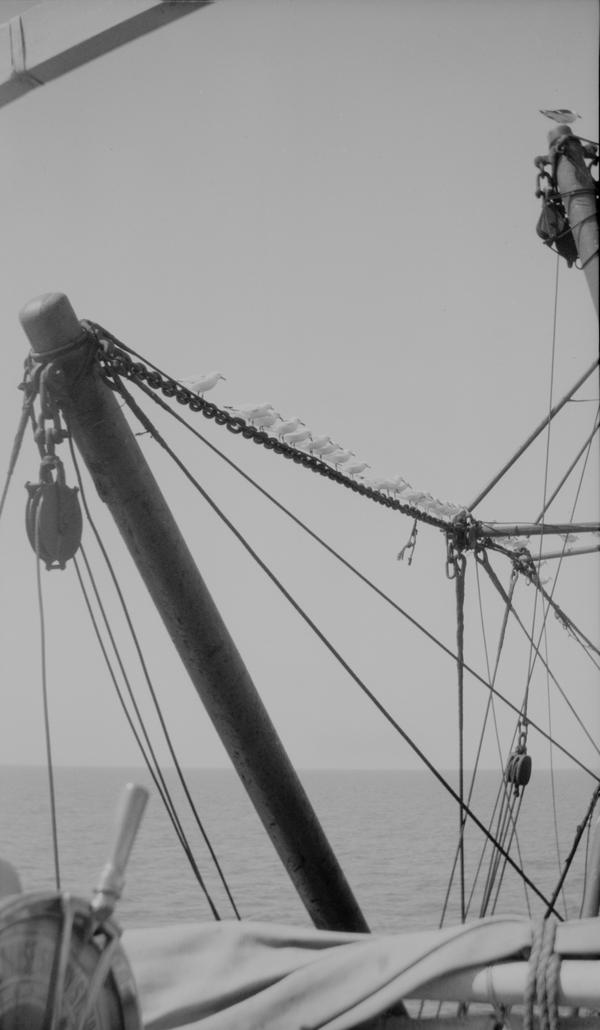This is the second envelope from the archive containing four negatives and one printed photograph of a ship crane with seagulls. The pony must be the same as on the first series of pictures but the car has a different registration number, 3643.