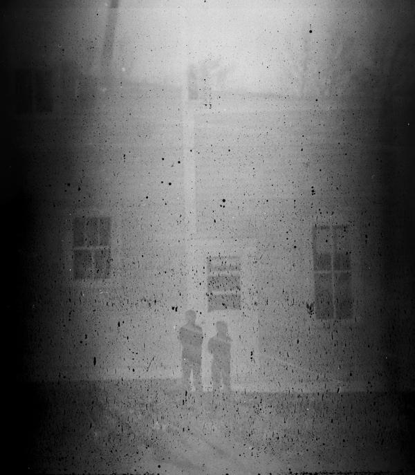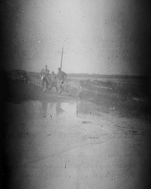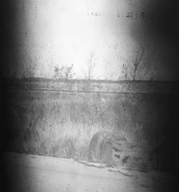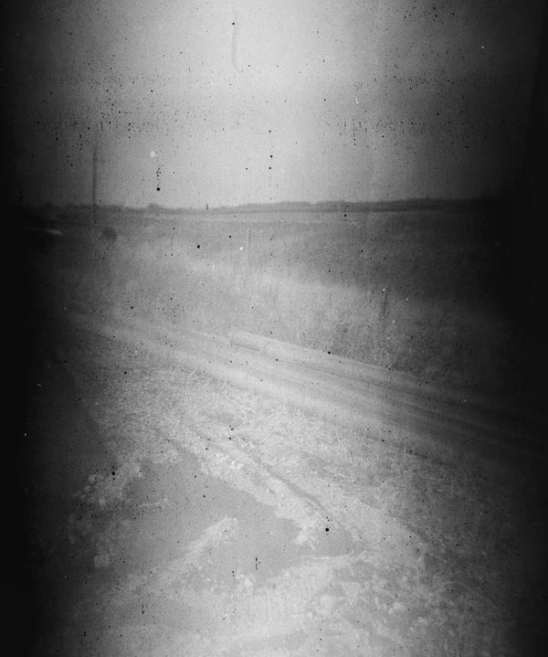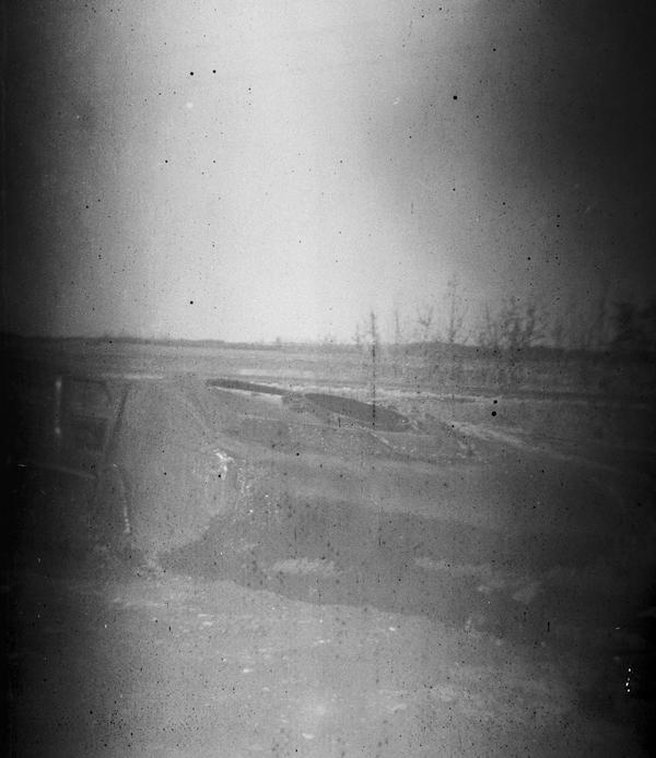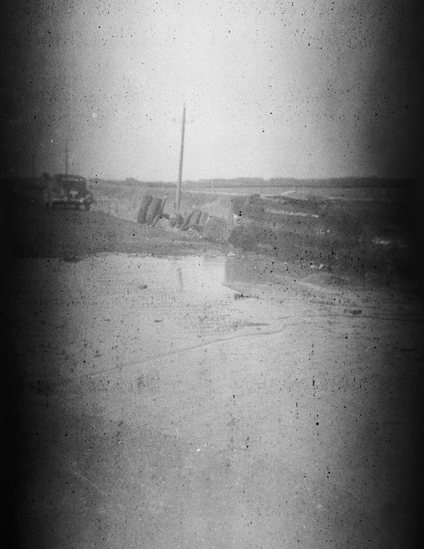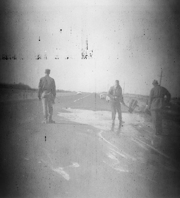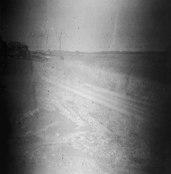 This roll could have been shot in the 1940s. The first frame appears double-exposed and shows two figures standing in front of a house. The remaining nine frames were shot at a scene of a car accident involving a cistern truck. The content of the cistern spilled on the road, and we see three people dealing with the consequences on this image. They appear to be wearing uniforms. There is also a person in a suit and coat holding some papers, probably an inspector. The details of the crash are documented on the remaining images, including the last two showing braking traces.